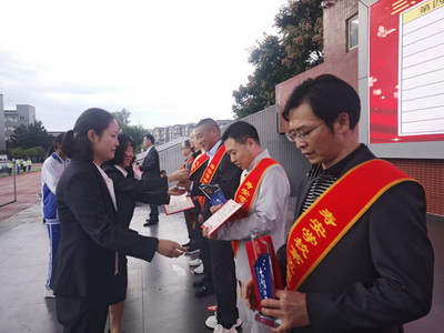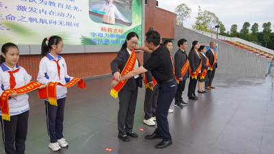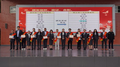 王良军副校长郑重宣读表彰决定,徐世宏副校长致颁奖词,杨华忠校长为他们一一绶带,上届获奖教师代表为本届获奖教师颁发奖杯、证书并送上真挚的祝福,薪火相传的感人场景将气氛推向高潮。